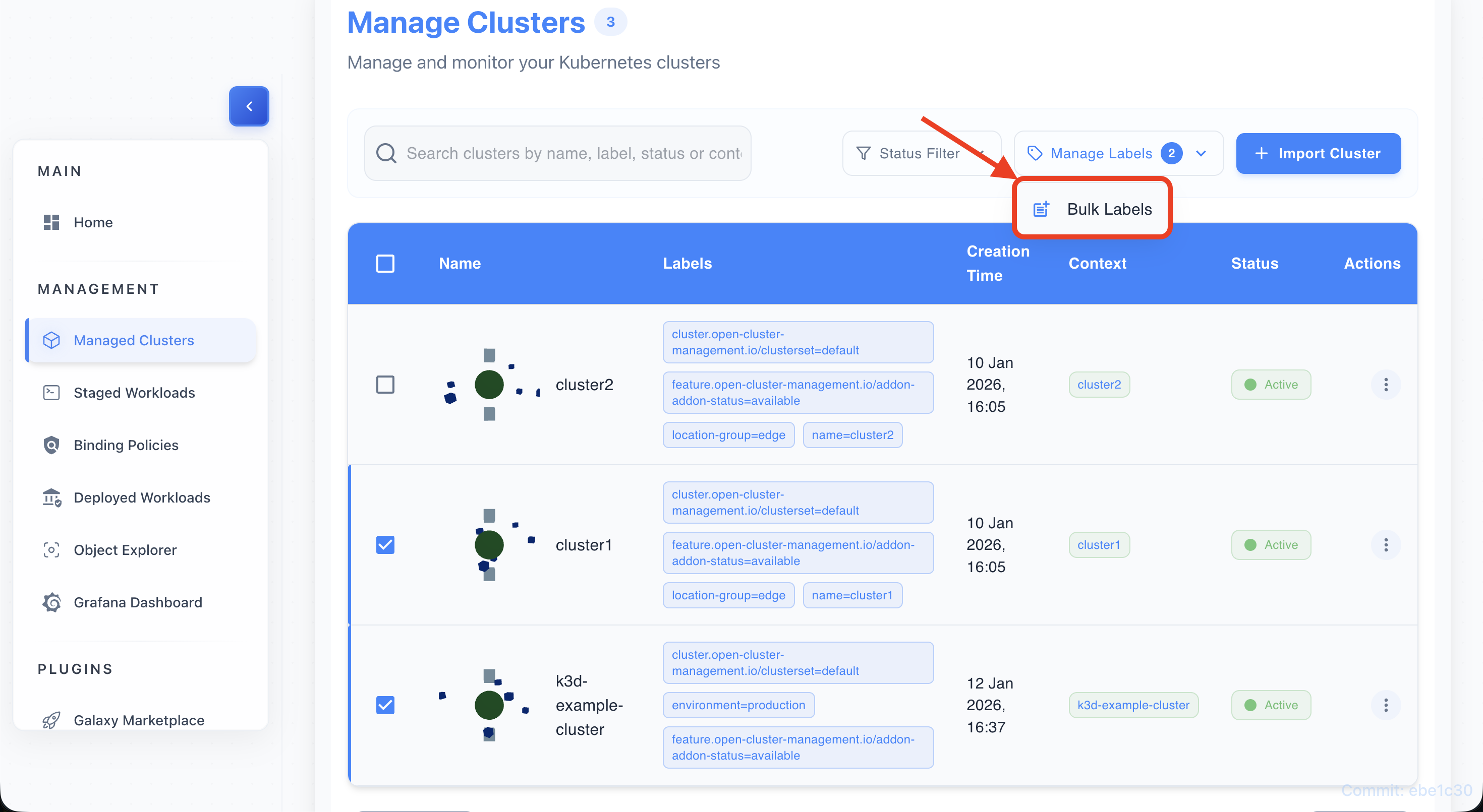 - Architecture: ITS aggregates cluster metadata, status, and labels from the KubeStellar backend. It presents search, filters, and actions to manage clusters and labels.