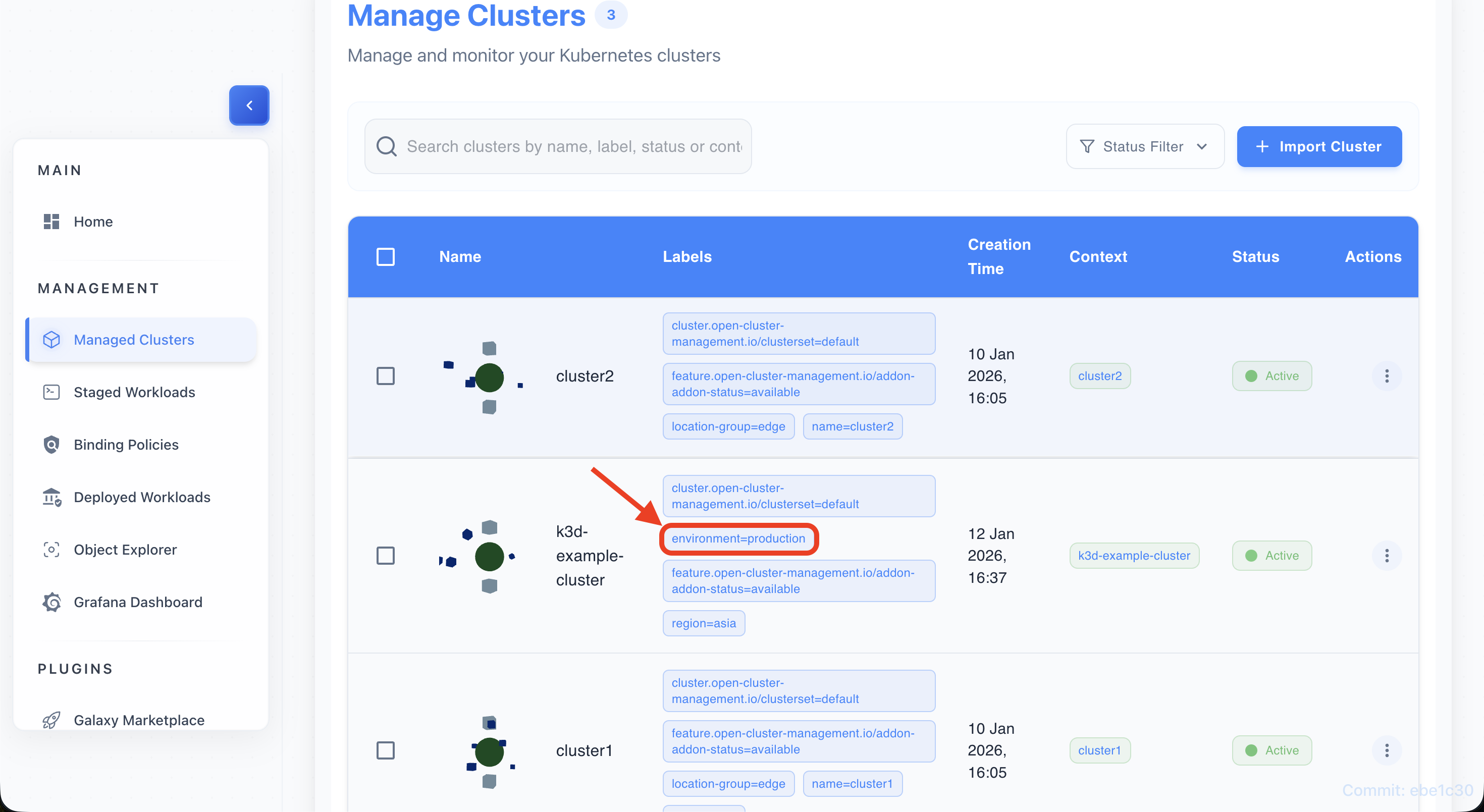 - The table updates to show only clusters matching the selected label.
