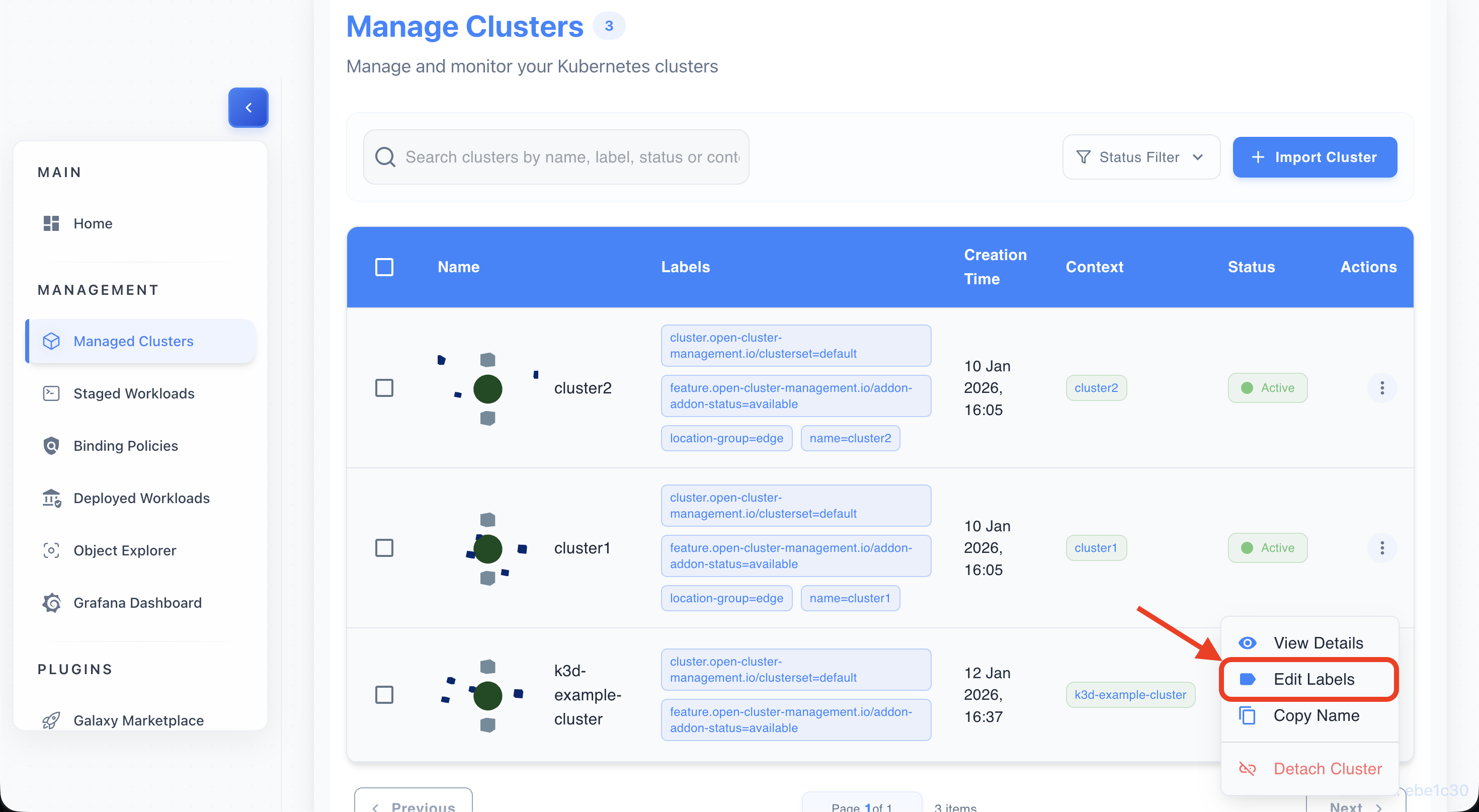 - Cluster lifecycle: Discover → Import → Label → Monitor → Detach. ITS keeps status in sync and exposes per-cluster detail dialogs and logs.